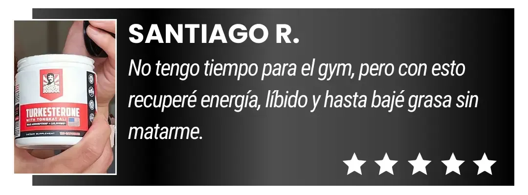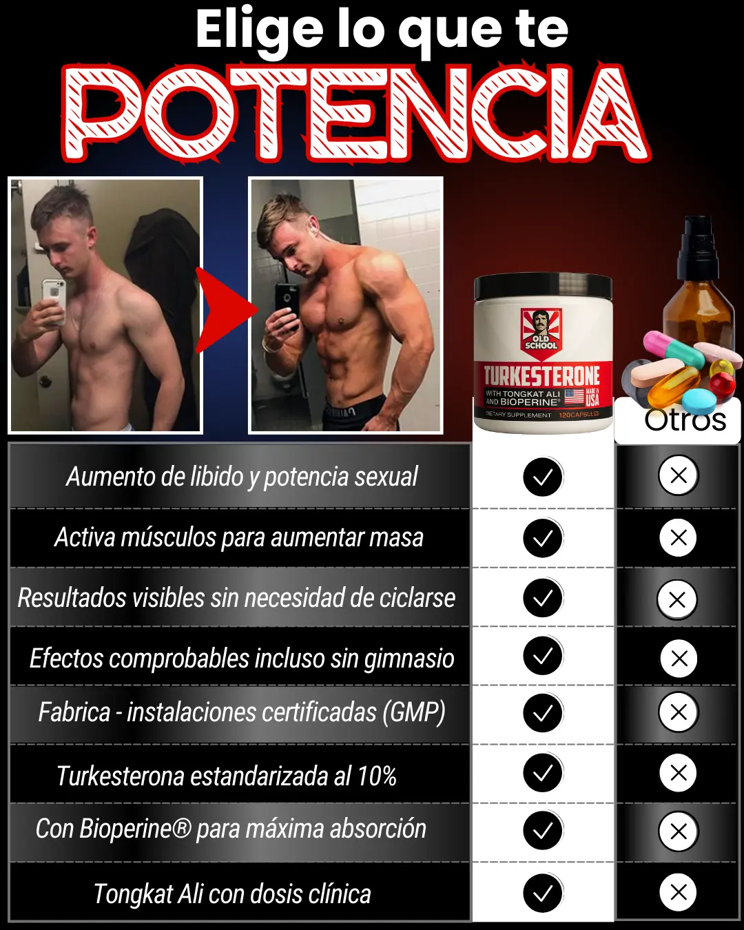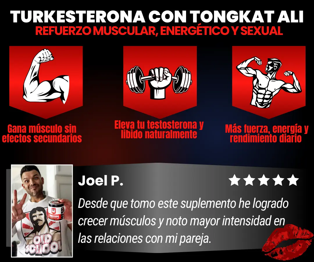 Fórmula natural con Turkesterona al 10% y Tongkat Ali clínico, creada para estimular músculo, fuerza y testosterona libre que permite mayor potencia sexual y rendimiento físico, incluso sin entrenamiento pesado